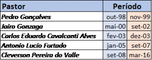 Desde sua organização a Igreja foi pastoreada pelos seguintes pastores: